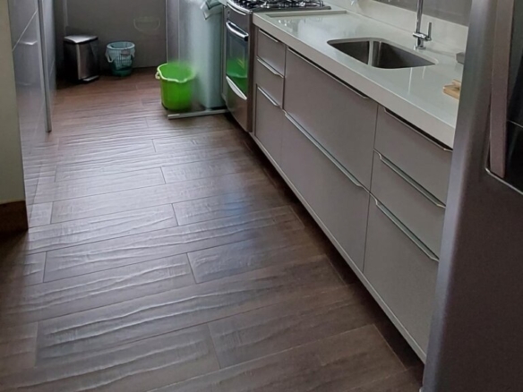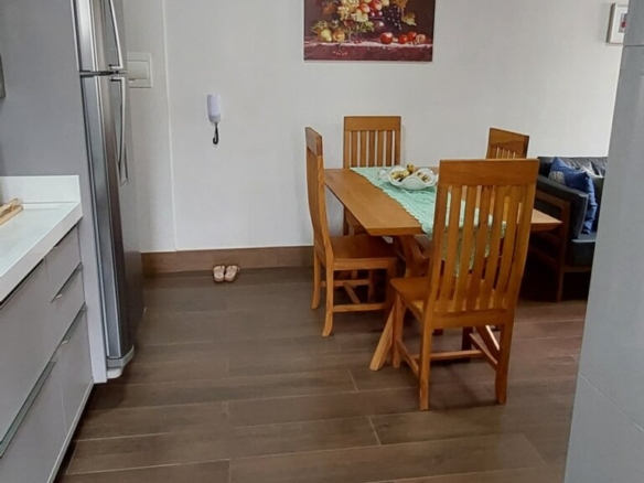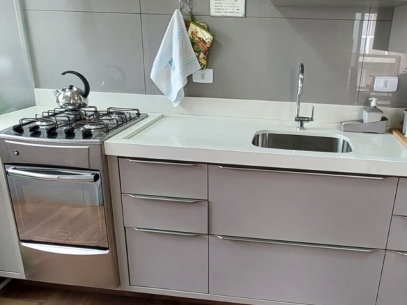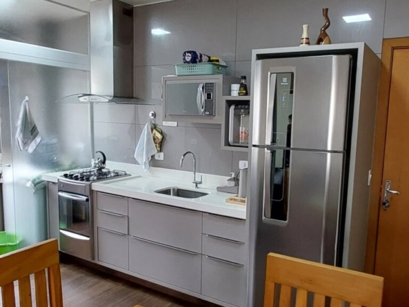 Cozinha com móveis planejados, e eletros fogão, micro ondas, filtro, geladeira, mesa c cadeiras, máquina de lavar